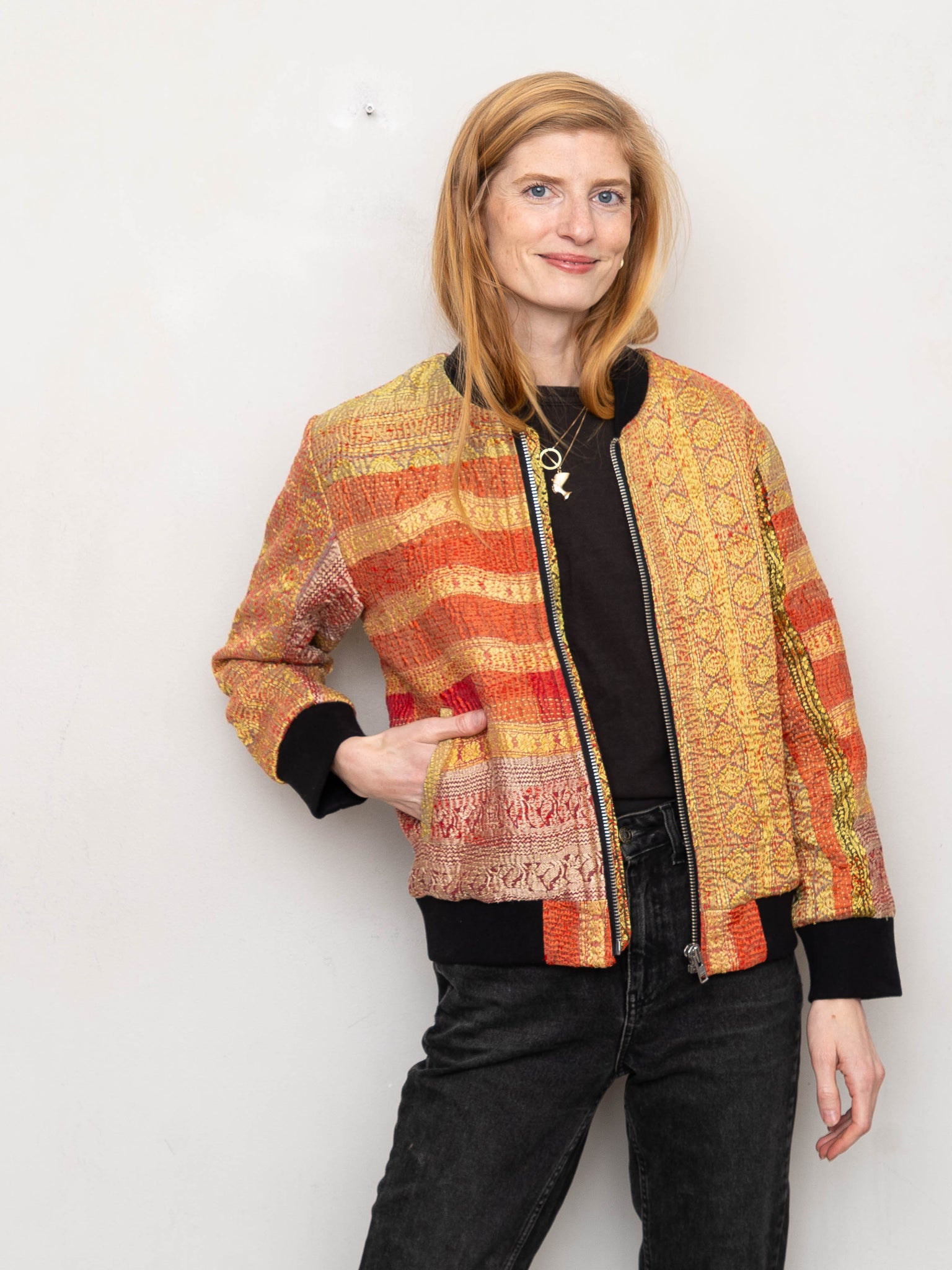 The Veda Quilted Bomber Jacket has a relaxed, easy fit, with the hem sitting at the high hip. It’s finished with a silver metal zipper, black cotton stretch collar and waistband, and thoughtfully placed side pockets. Inside, you’ll find cotton-voile lining and an interior pocket for essentials. Each piece is one of one.
