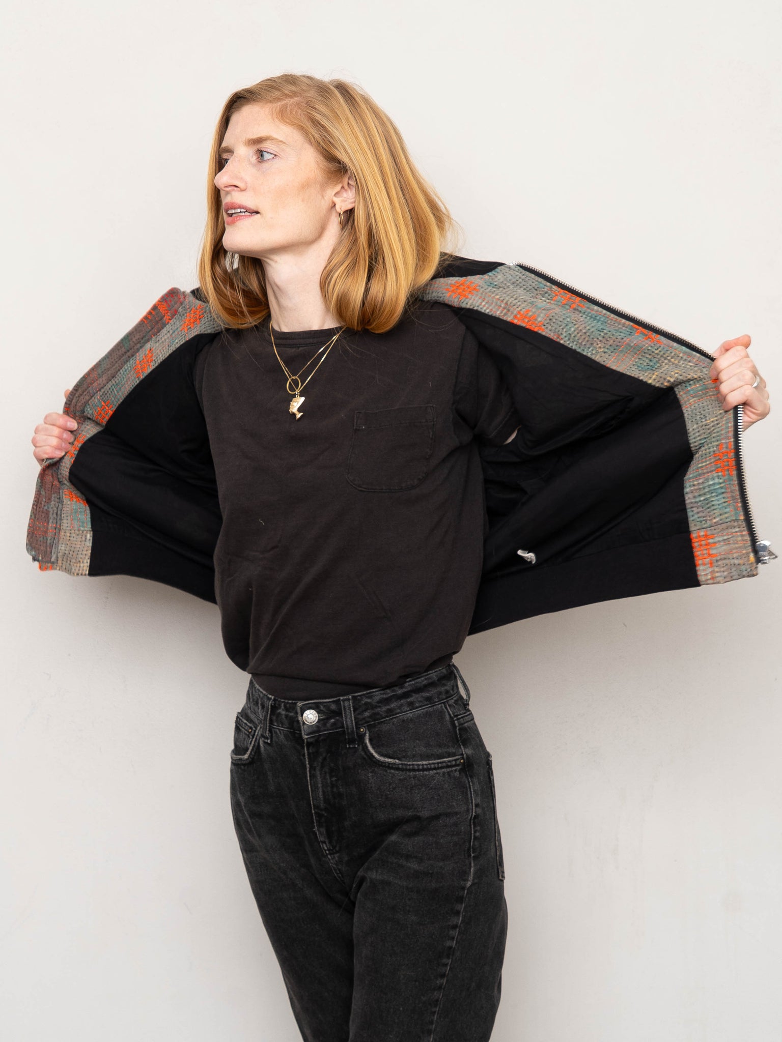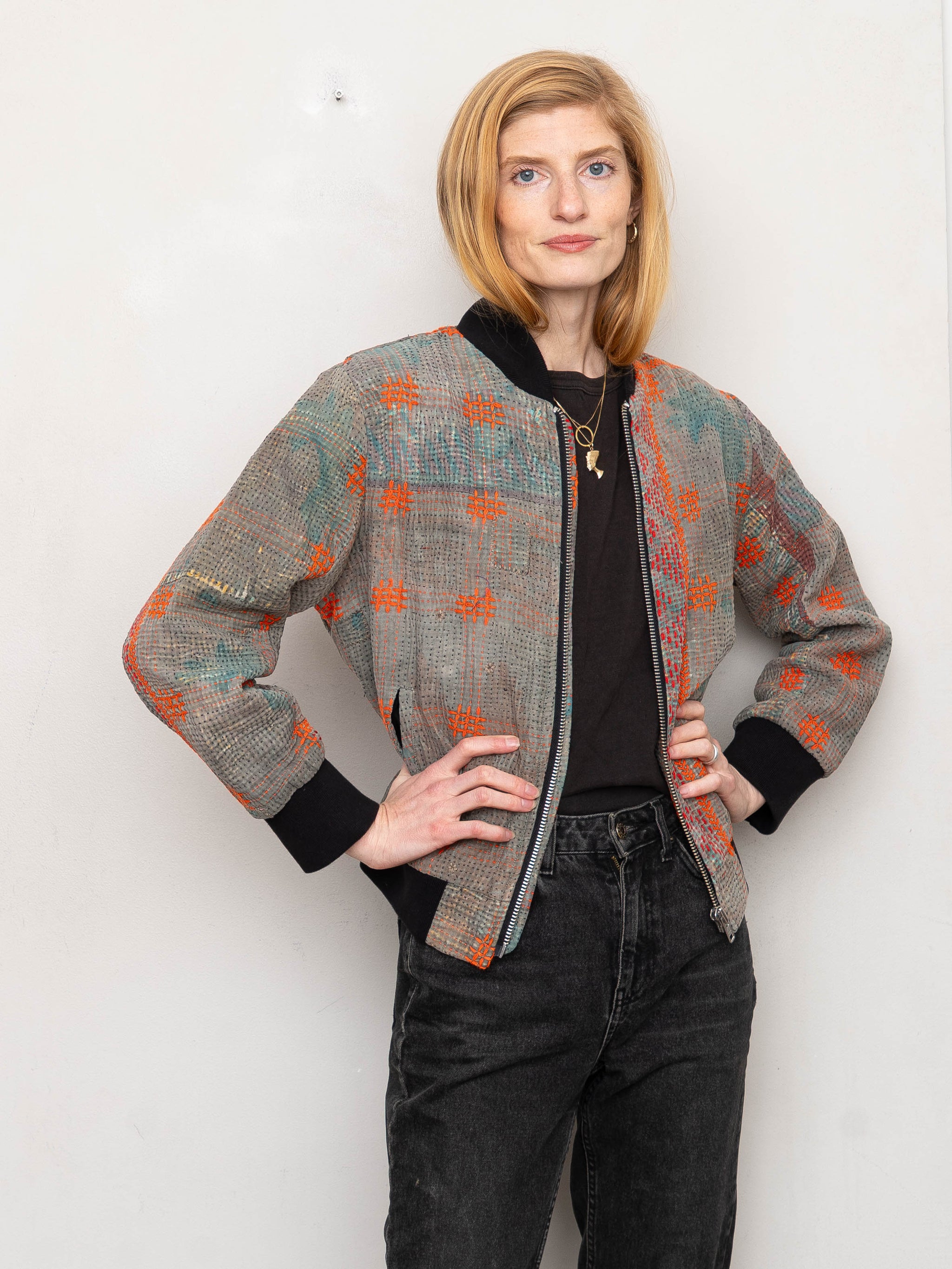 The Veda Quilted Bomber Jacket has a relaxed, easy fit, with the hem sitting at the high hip. It’s finished with a silver metal zipper, black cotton stretch collar and waistband, and thoughtfully placed side pockets. Inside, you’ll find cotton-voile lining and an interior pocket for essentials. Each piece is one of one.